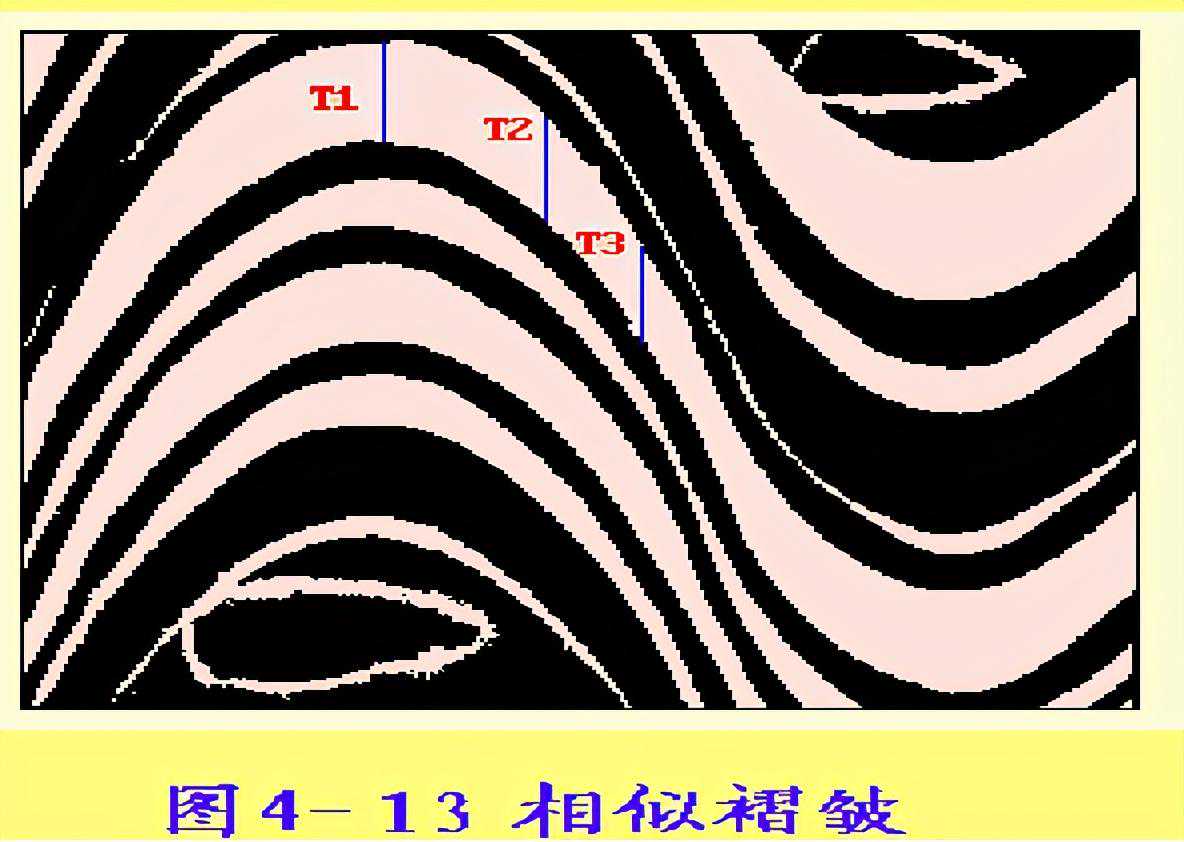 典型的相似褶皱的几何特点是组成褶皱的各褶皱面作相似的弯曲各面的曲率相同,但没有共同的曲率中心。各褶皱层的厚度发生有规律的变化,两翼变薄,转折端加厚;平行轴面的厚度在褶皱各部位保持一致。
