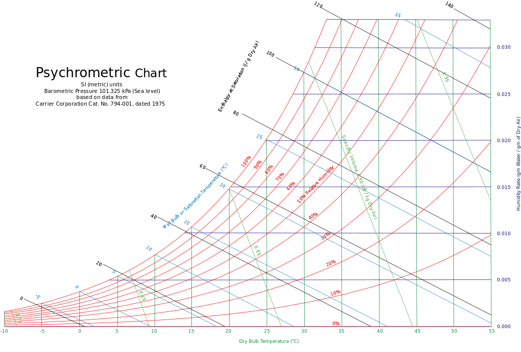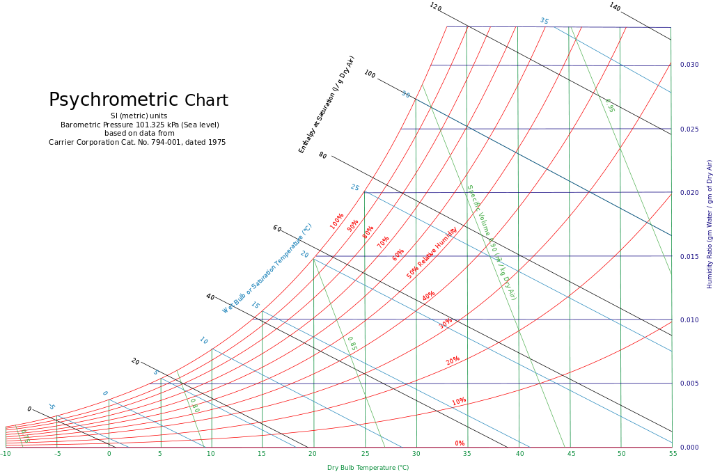 本章会聚焦于焓湿图(如下)进行基本概念的阐释和温室场景中的具体应用,以便更深入的理解该图对实际生产的指导意义。
