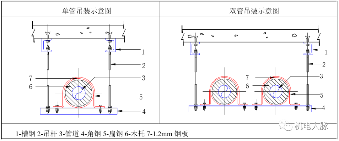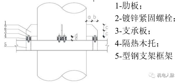 7)管道木托厚度≤横担宽度,其高度应与保温厚度匹配,采用抱卡固定与横担上,以起到绝热作用。