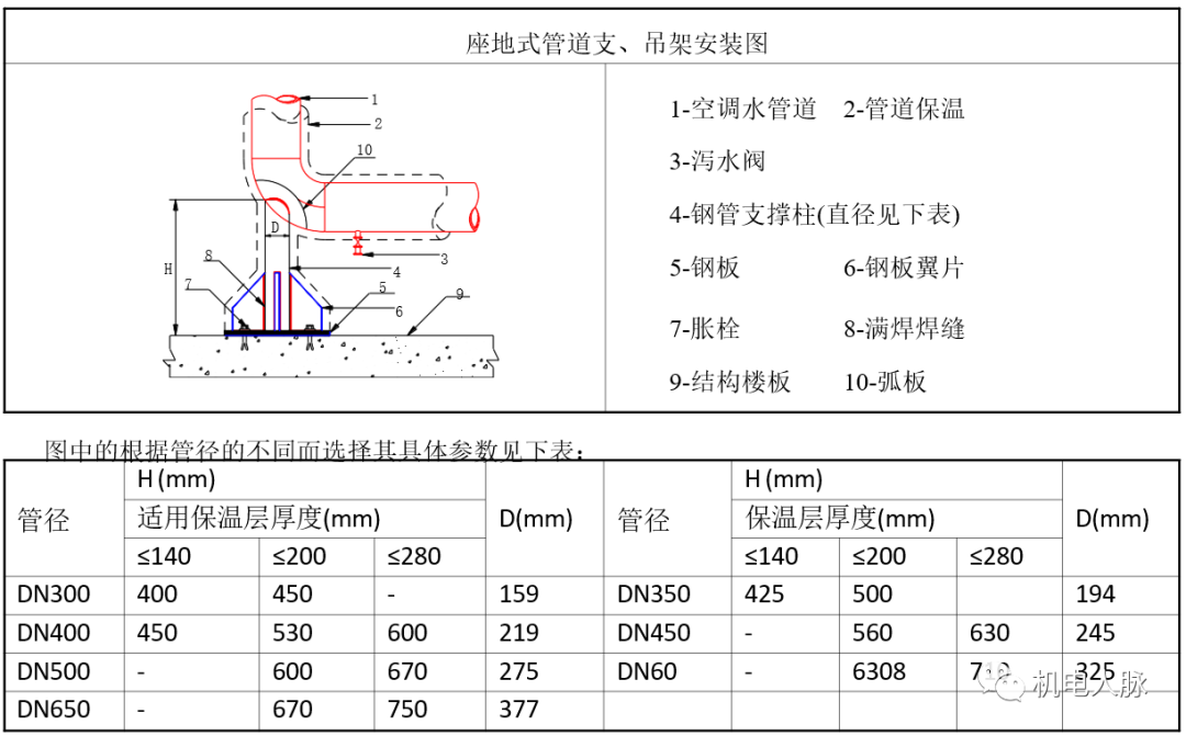座地式管道支架一般用于立管的底部,用于支撑管道和防止管道发生两侧位移。由于该支架承受较大的力,分布在此部位的集中荷载很大,因此在设计安装时应与结构专业积极配合,必要时采取楼板加固措施保证结构强度。