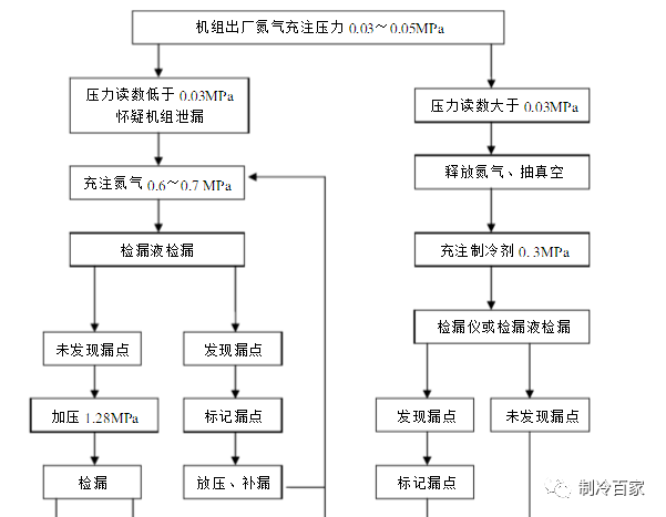 1)、准备氮气,加气管及减压阀,对机组内充灌氮气,压力0.6~0.7MPa时,关闭进气阀,并用检漏液检漏,检查所有漏点。