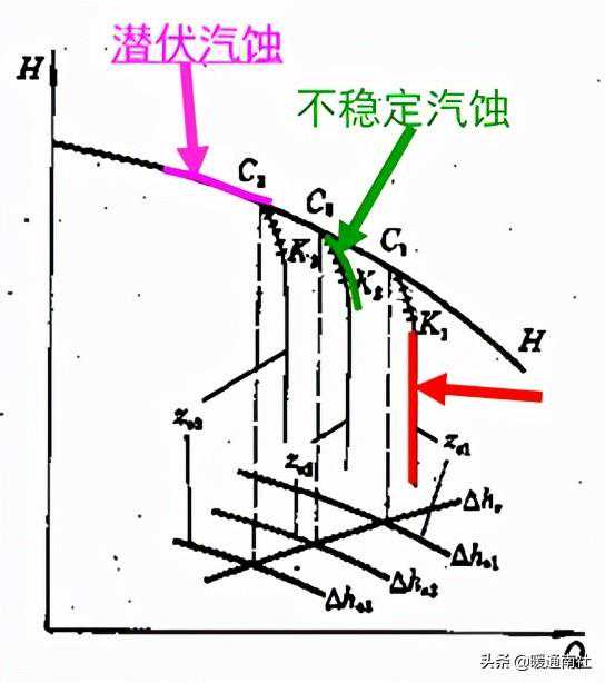 2、随流量增大,当△ha≈<△hr时,气泡已经发展到一定程度,它使流道面积减小;气泡在高压区破灭时也要消耗能量,故流量、扬程、效率都明显降低。同时产生振动和噪声。此状态称为不稳定汽蚀。画斜线部分。最容易破坏部件区域。
