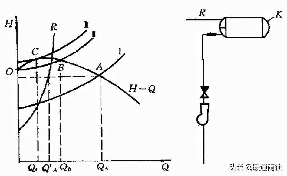 ②向含有空气的高阻力管路供液:K处有气体,K与泵间的管路特性为Ⅰ,K以后的管路特性为R,QA>Q`A气体被压缩压力升高工况点A→B→C,直到Q=0,K后液体流出,气体膨胀压力下降,泵与K间的管路特性降至Ⅱ要下移时,工况点到B,引起喘振。