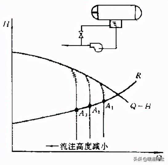 使泵在稳定汽蚀状况下工作来调节流量的方法。凝水水位越低,流注吸高越小,有效汽蚀余量越小,断裂工况线左移,流量减小。要求:设计良好的管路特性;水位应在一定范围波动(设蓄水室);设回流管以防水位过低。