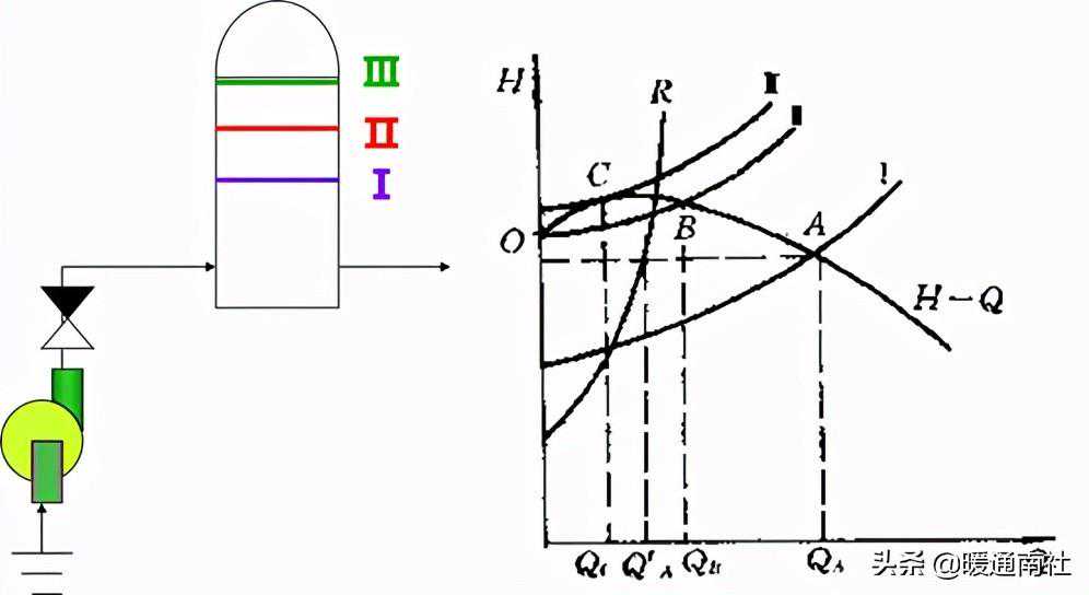 ①向压头较大且周期性发生变化的容器液位供液:Ⅰ→Ⅱ→Ⅲ供液,工况点A→B→C。Ⅱ←→Ⅲ波动变化,工况点在B←→C←→O变化,导致周期性水击,产生噪音和振动。