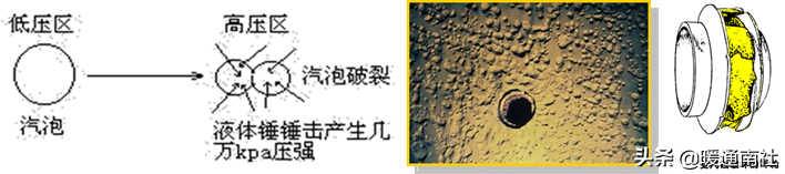 流到高压区,迅速凝结,气体重新溶人液体,造成局部真空,四周液体质点以极大速度冲来,互相撞击,产生局部高达几十MPa的P,引起噪音和振动。