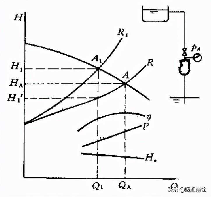 关小排出阀,泵流量减小,功率降低,效率降低,工作扬程增加,允许吸上真空度增大;原管路所利用的扬程为H`1,H1-H`1为关小排出阀的节流损失。