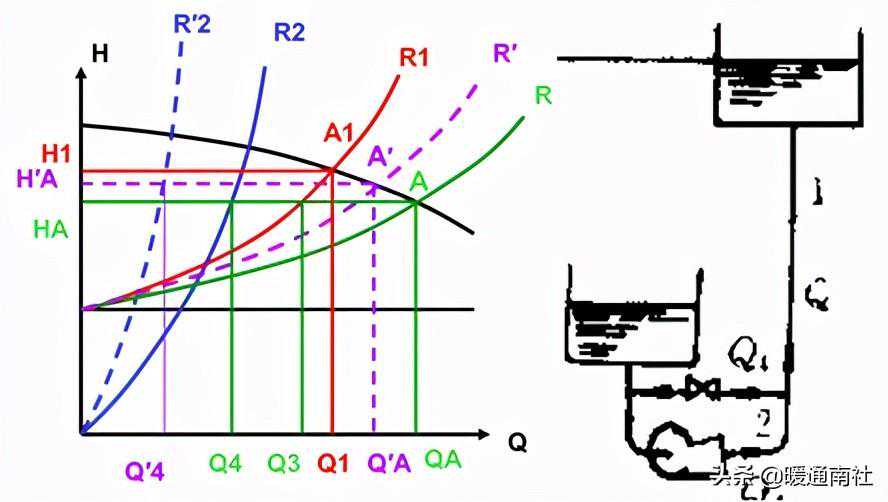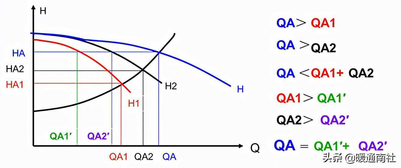 不开旁通阀,A1(Q1,H1);开旁通阀,同样扬程下,两并联管路流量相加,泵A(QA,HA)。主管路(Q3,HA),回流管(Q4,HA);关小回流阀,泵流量减小,扬程增加,主管路流量增加;开大回流阀,泵流量增大,扬程减小,则主管流量减少。
