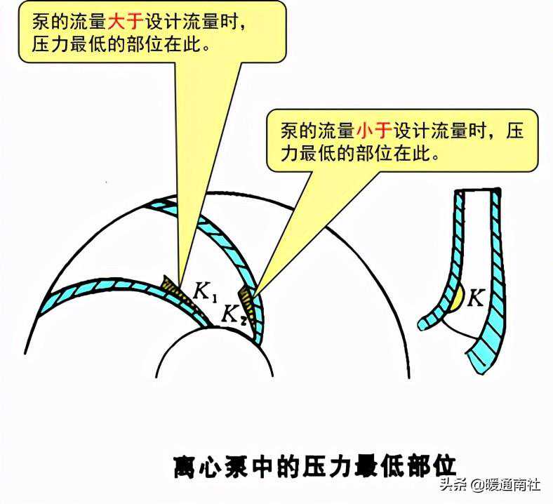 当Q超过设计Q时,w1撞击叶片背面,最低压力部位在叶片进口靠近前盖板的叶片正面上,如图K1处。