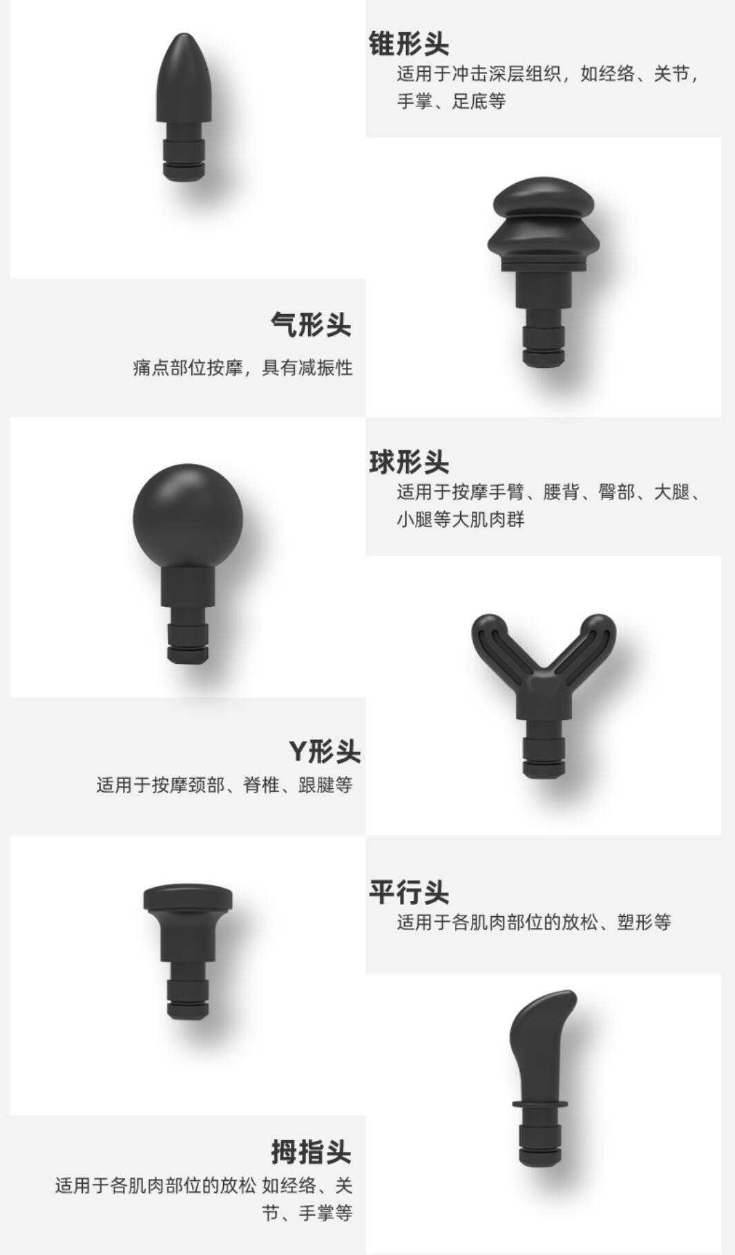 这把按摩枪有提供了多达6款的按摩头,除了常用的这个按摩大肌肉群的球形头,还有能够按摩足底的锥形头。有了这把筋膜枪,足底按摩也有了新的玩法。