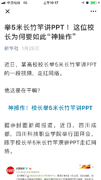 学校视创新为生命,校长陈宇博士更是创新思维的引领者和实践者。2019年初,他以“5米长竹竿做教鞭”的课堂创新方式,活跃课堂气氛,得到了新华社、、人民网、腾讯、爱奇艺、《》等上百家主流媒体集体点赞和报道,阅读人次破千万,成为轰动全国的热点事件!