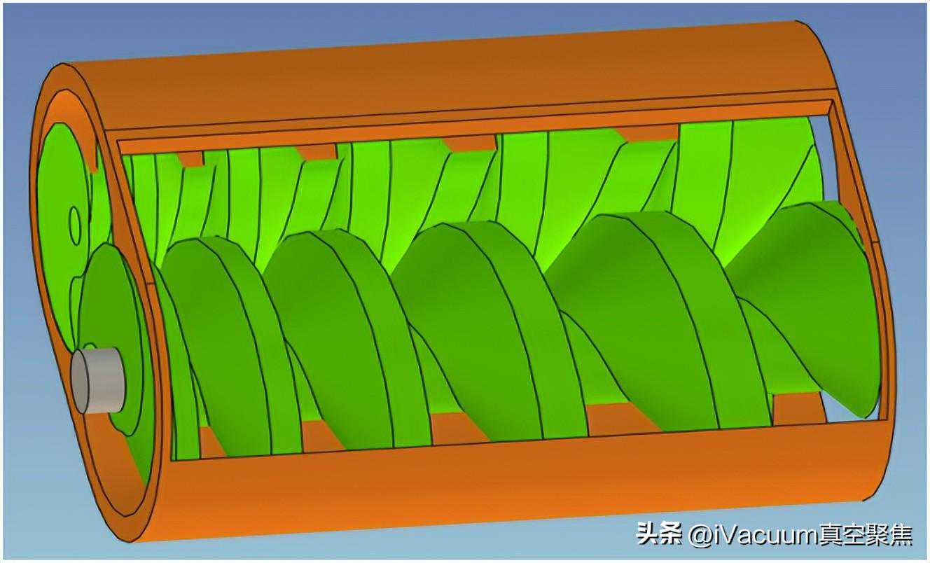 螺杆泵吸排气过程可以理解为单头齿轮啮合封闭空间形成气体输运,每一个螺距就是一级罗茨泵,经过多个节距形成适当的压缩比和差压。