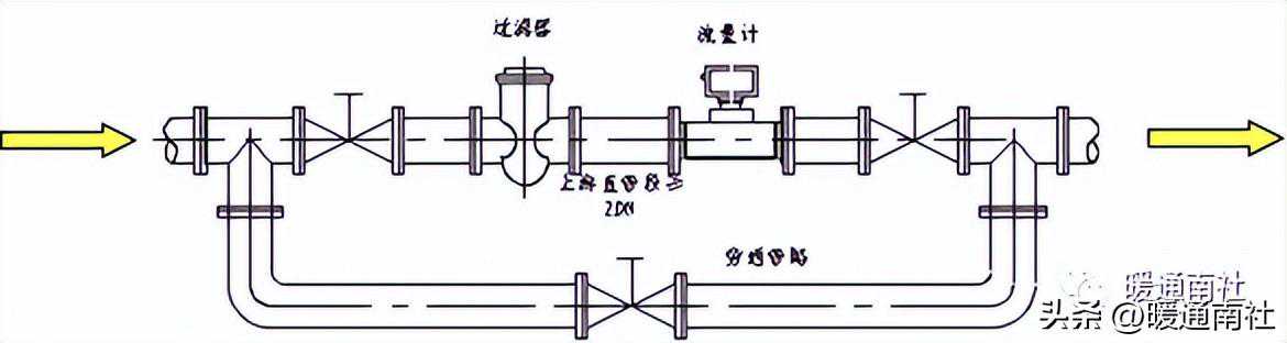 由于流量计需维修与标定,故为了保证正常供气,宜设置旁通管路。在正常使用时必须关闭旁通管道阀门;