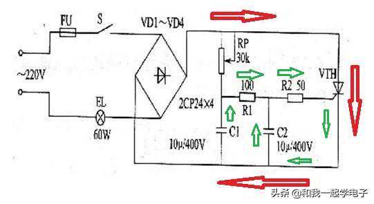 ↑VTH是一个P型单向晶闸管,220V交流电经灯具EL和全波整流后,通过RP给电容C1和C2充电,当电容电压充到晶闸管VTH导通电压时,VTH导通,EL发光,晶闸管不在受G极控制