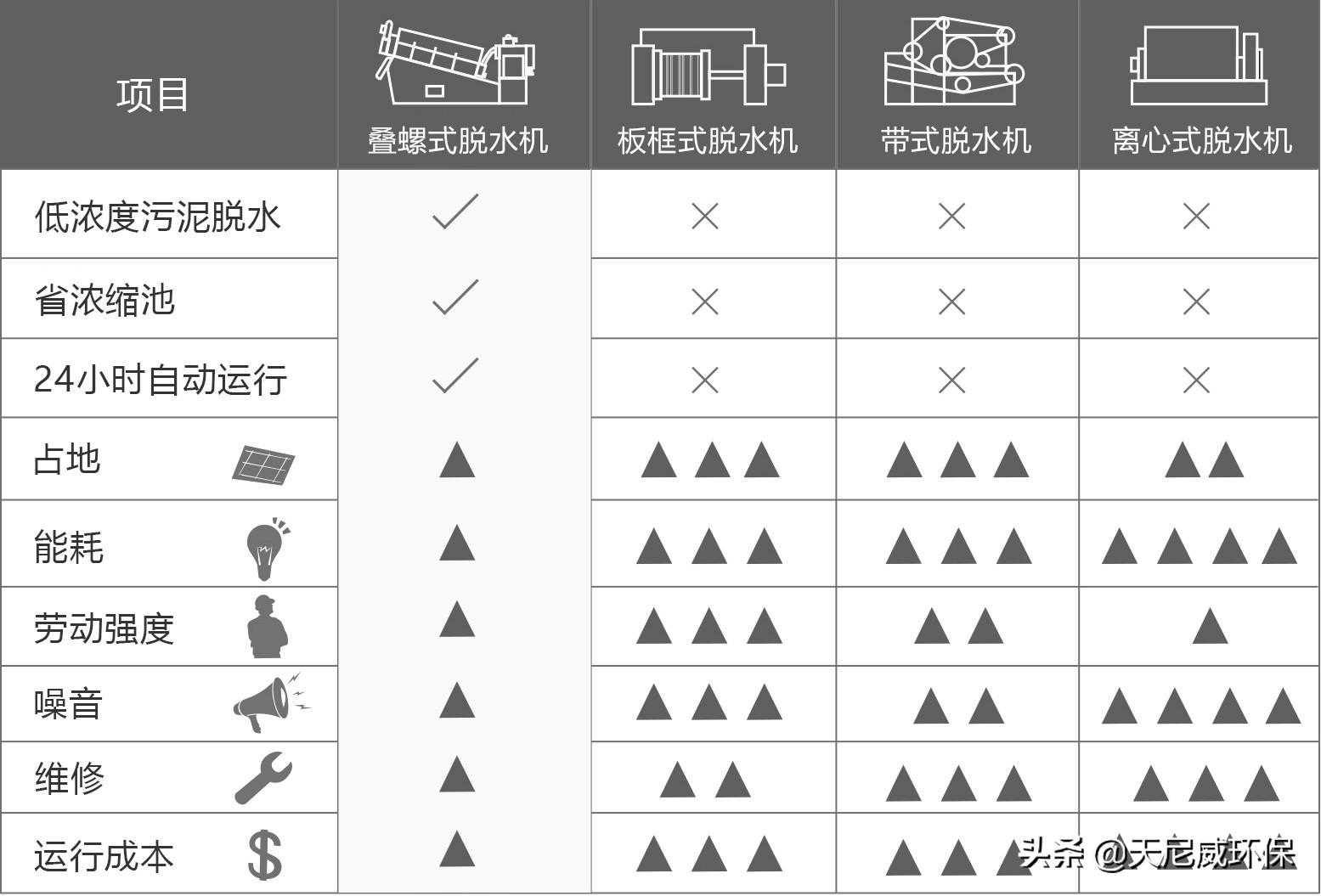 叠螺机与其他污泥脱水机的比较如图: