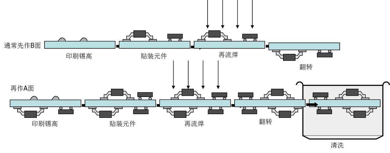 回流焊的工艺流程较为复杂,可分为两种:单面贴装和双面贴装。单面贴装的流程包括预涂锡膏、贴片(分为手工贴装和机器自动贴装)、回流焊、检查及电测试。双面贴装的流程则在此基础上进行两次预涂锡膏、贴片和回流焊的操作,最后在检查及电测试环节结束。