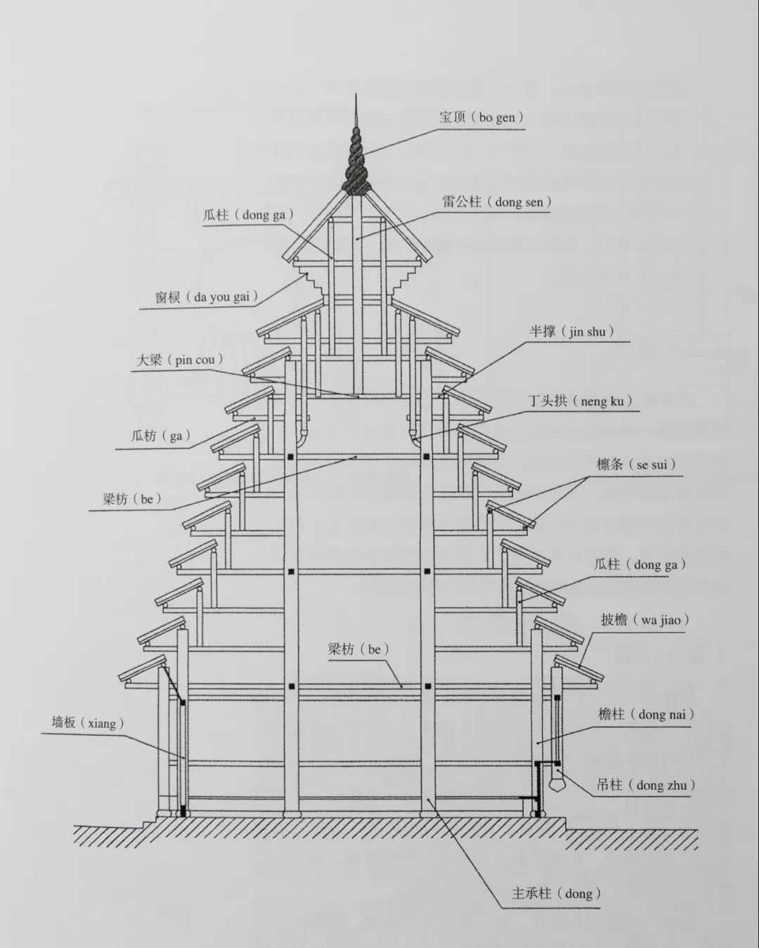▲侗寨的木构体系几乎囊括了木构建筑的全部手法和经验,这是平铺下寨鼓楼构架图。图源/《广西三江侗族自治县鼓楼与风雨桥》