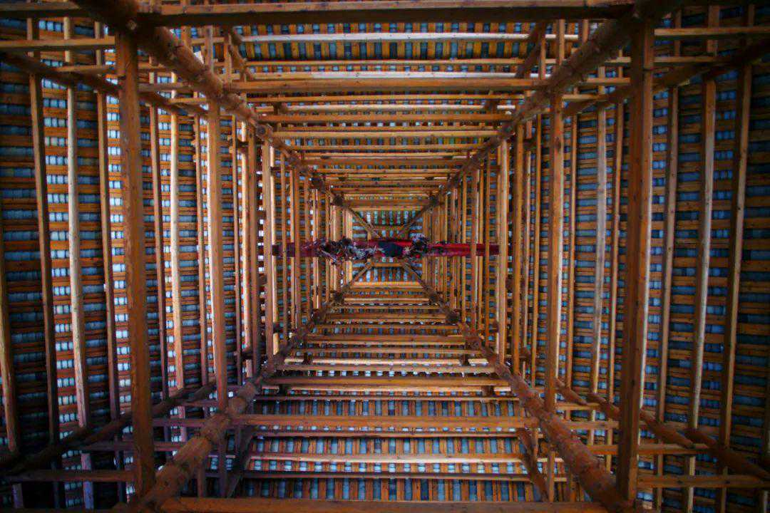 ▲常见的四角鼓楼内部结构。鼓楼通体全是本质结构,不用一钉一铆,由于结构严密坚固,可达数百年不朽不斜。摄影/李玉祥