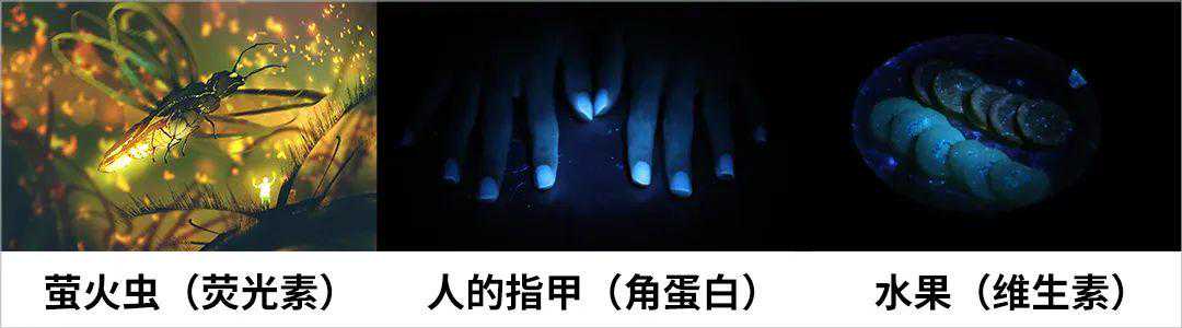 最常见的,萤火虫(荧光素)、人的指甲(角蛋白)、水果(维生素)……