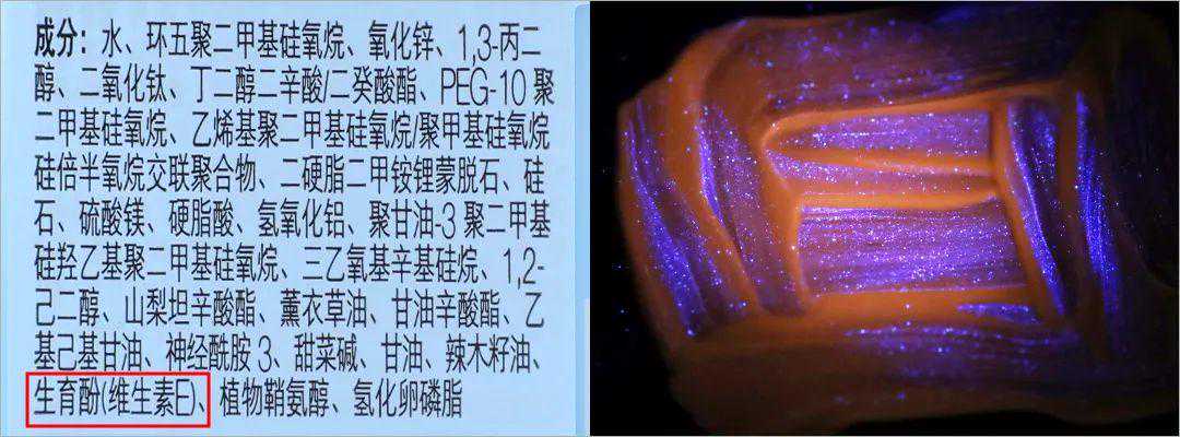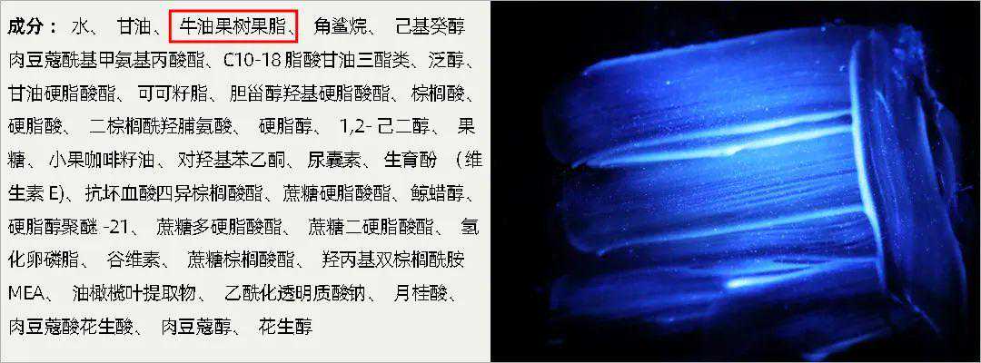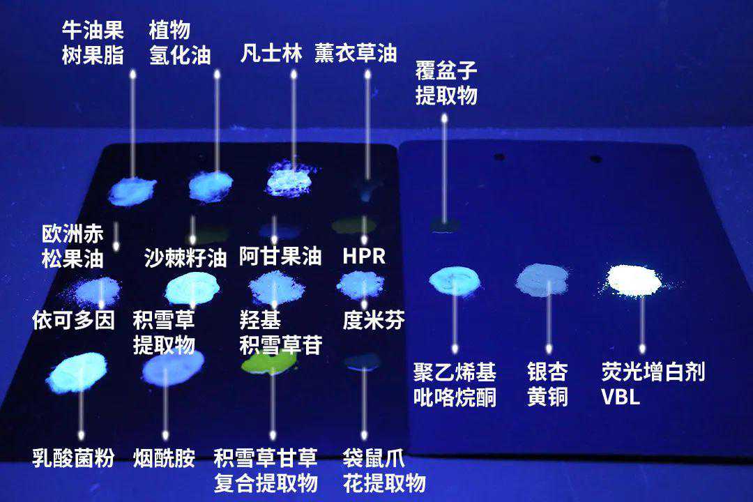 其中,牛油果树果脂、植物氢化油、凡士林、依可多因、积雪草提取物、羟基积雪草苷、度米芬、乳酸菌粉、烟酰胺等这些物质,产生的蓝紫色荧光现象与荧光增白剂非常相似。