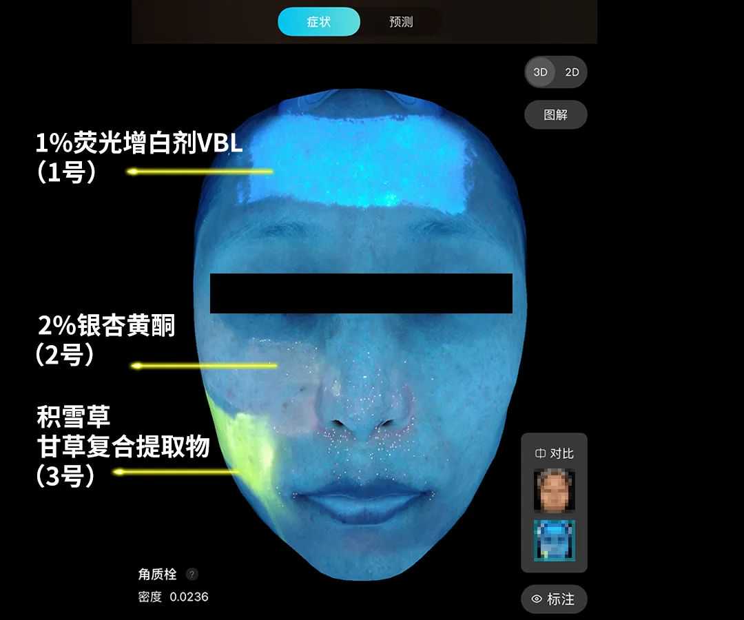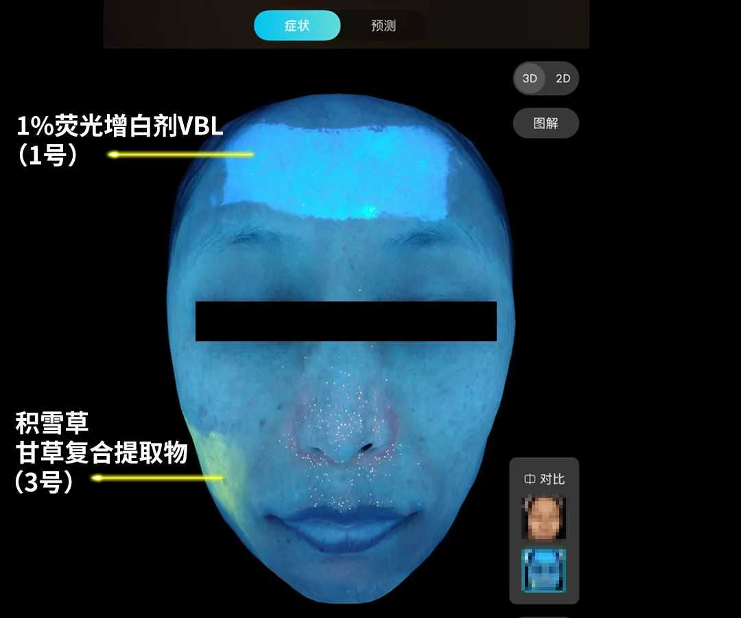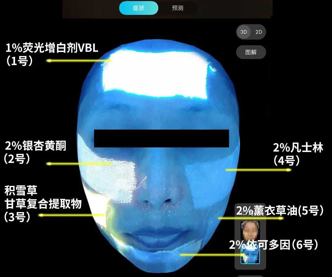 为了验证这些有较强荧光反应的成分对皮肤的影响情况,研究员小姐姐“亲自上脸”,把纱布浸泡在这些成分里,并使用皮肤成像仪进行拍照。