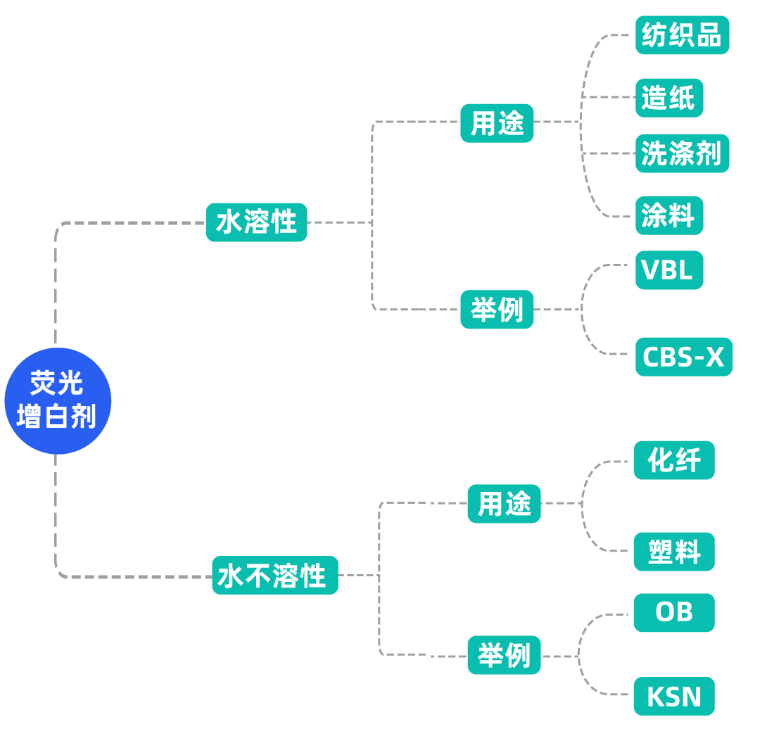 因此,荧光剂也被广泛应用于纺织品、造纸、洗涤剂、塑料等领域。简而言之,一切白色或者想要增白的产品里,都可能有荧光剂的身影。按理化性质,荧光剂可分为以下两类: