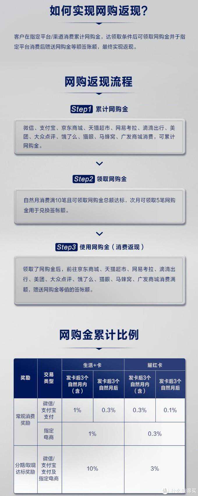生活+卡下卡后三个自然月内在指定渠道消费可获得1%的网购金,三个月后可以获得0.3%的网购金,通过消费每月获得网购金的上限是100元;此外通过分期取现也能获得网购金返现,返还的比例高达10%,而且不受时间限制,卡片有效期内都是10%。这部分的上限也是100元。两者相加,生活+卡每月最多可获得的网购金为200元,一年为2400元。