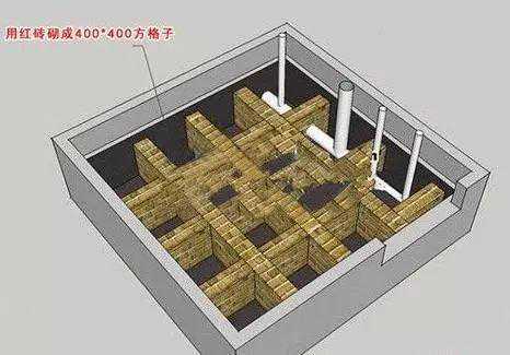 步骤2:红砖或混泥土做隔断架空,把沉箱分成若干个400*400左右的格子。这一步很多人都不去做,其实这是相当重要的一个步骤,有了这样一个承重的隔断,上面的混泥土层就不会往下坠了。否则几年之后卫生间地面下沉开裂漏水。