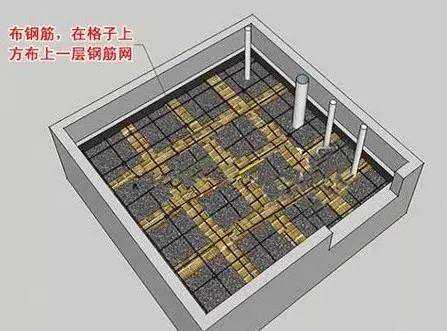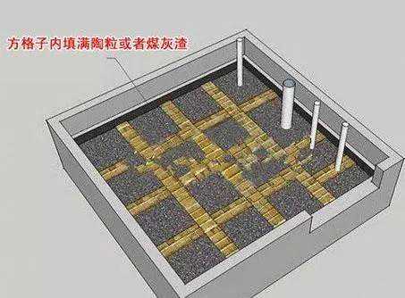 步骤3:填陶粒或者煤灰渣。把防潮陶粒与格子里面填,不用压得太紧,自然一点,因为它是不承重的,只起吸收水气的作用。