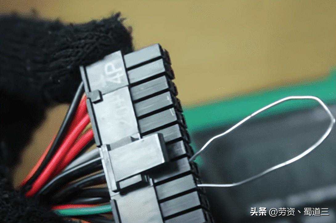 断开连接器后,将它们与电源线分组以方便测试。使用细线将针脚15和16连接到24针主板电源连接器。