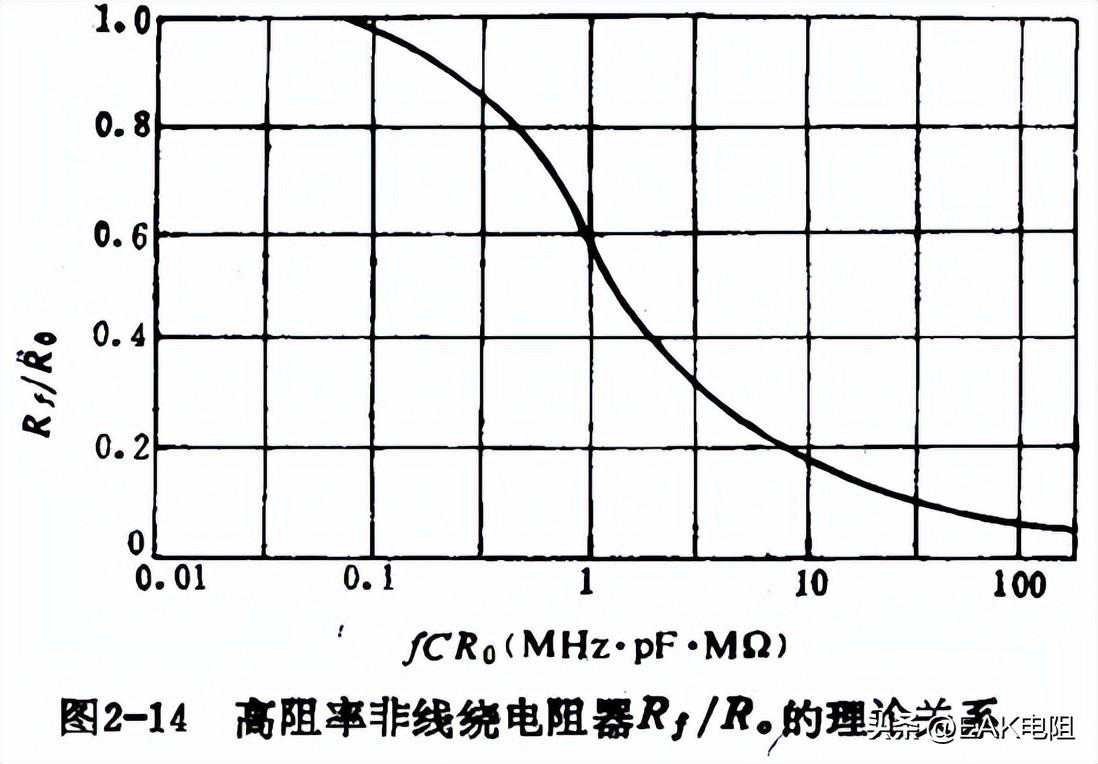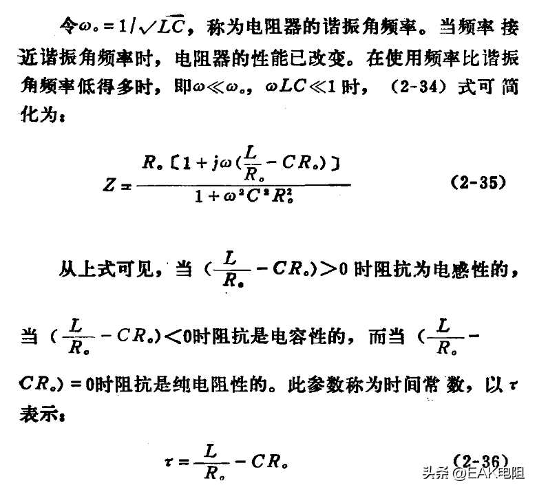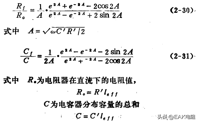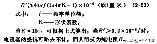 当频率低而满足R'∞L'时,可将感抗略去不计,把电阻器看作阻值为R。的纯电阻。若∞工'≤0.1R',再设低阳值电阻器不刻槽,工'可用公式(2-28)计算,于是得到条件为