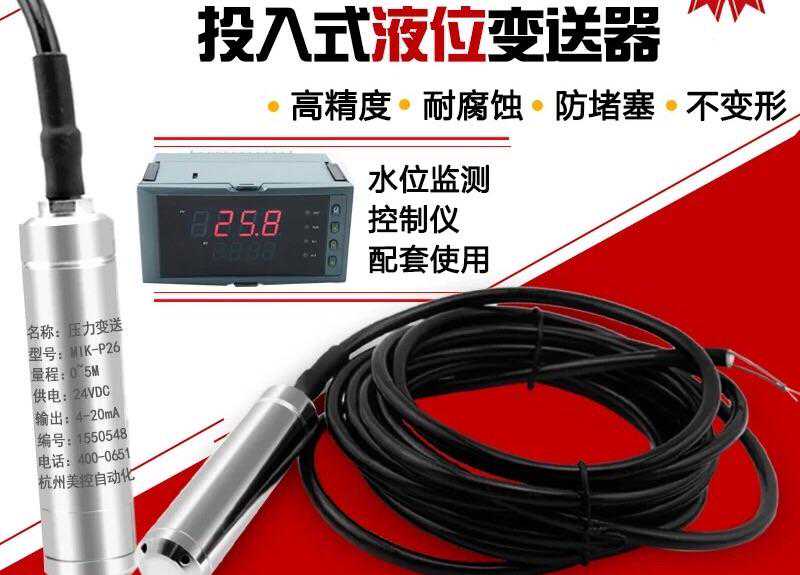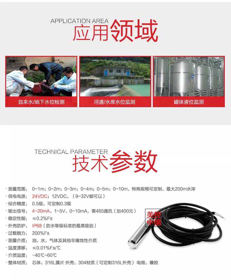静压投入式液位变送器(投入式液位计)适用于石油化工、冶金、电力、制药、供排水、环保等系统和行业的各种介质的液位测量。精巧的结构,简单的调校和灵活的安装方式为用户轻松地使用提供了方便。4~20mA、0~5v、0~10mA等标准信号输出方式由用户根据需要任选。投入式液位计的不锈钢传感器带有可伸长的聚亚安酯外壳材料的电缆线,该投入式液位计可选择带有重锚的传感器,这种投入式液位计应用在有波动或急流的液体环境中。