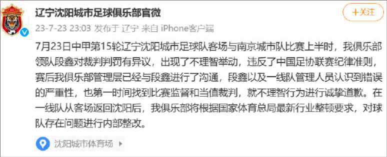 主裁判竟被主教练扇耳光!这一幕发生在7月23日中甲第15轮辽宁沈阳城市足球队与南京城市队比赛上半场补时阶段,沈阳城市主教练段鑫因对主裁判的判罚不满,被出示红牌后扇了主裁判一记耳光。辽宁沈阳城市俱乐部当晚回应称,球队已深刻认识到错误的严重性,赛后第一时间就不理智举动向主裁判道歉,并将进行内部整改。