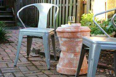 把大陶罐变成一个吸引人的边桌,在院子里享受一杯柠檬水或冰茶。通过混合水和水,赋予罐子风化的外观花园石灰,将它刷在锅上,然后当它变干时,用砂纸打磨掉一些石灰。将花盆从底部到底部堆叠成一个简单的临时桌子,增加一个大的植物托盘作为桌面。用耐用的粘合剂将桌子固定在一起,使桌子更持久。