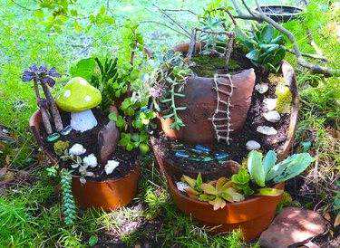 即使是破损的陶罐也不是没有价值的。将它们转化为仙女花园,配有可爱的服饰。排列罐子,让那些还能装脏东西的罐子坐在底部。添加泥土和更多破碎的罐子碎片,为仙女和她们的朋友创造蜿蜒的小路和小花园。种几株多肉植物或者加一片长满青苔的草坪来打造仙女的院子。安排微小的人造蘑菇,绳梯,吸引人的石头和任何仙女珍爱你可以找到完整的外观。