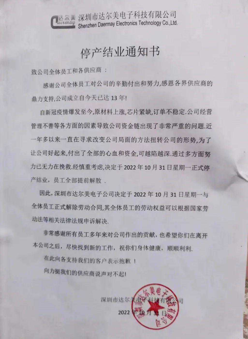 通知中,达尔美称因新冠疫情爆发至今的原材料上涨、芯片紧缺和订单不稳定等导致公司资金链严重问题,无力挽救决定于当日停产结业,员工全部提前解散。