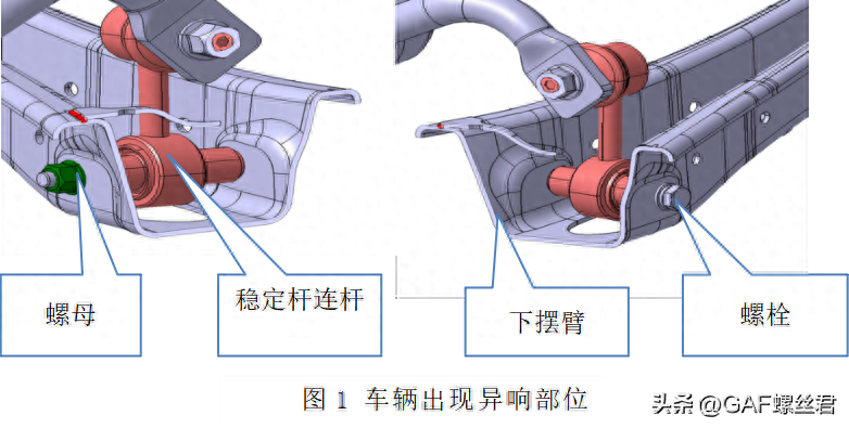 下摆臂和连接杆是被螺栓和螺母紧固连接在一起的,如果有足够的夹紧力,应该像一个零件一样运动。异响实际是夹紧力不足,两个零件有松动滑移摩擦产生的。