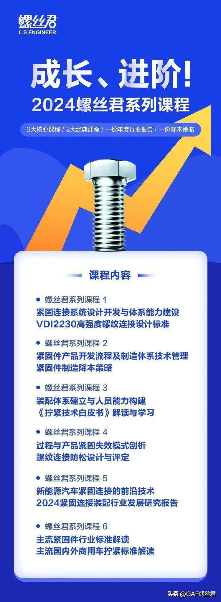 为满足在紧固、连接、装配领域工作的小伙伴的学习需求,2024年,GAF螺丝君重磅推出《2024螺丝君系列课程》。需要了解详情或者报名的小伙伴,可以后台私信了解。