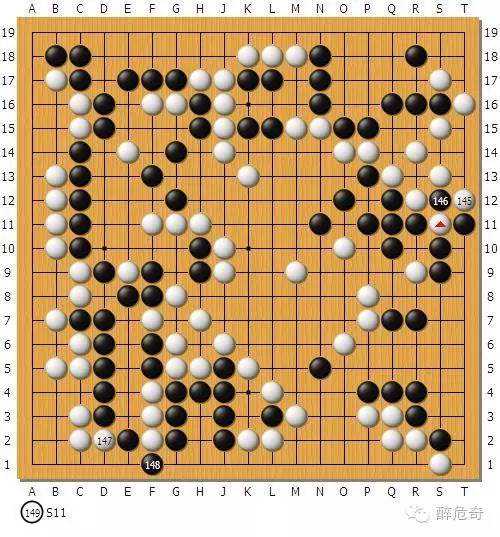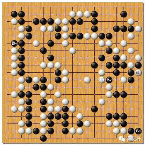 11谱150立放弃打劫,一边收官同时保护中间小飞一子的联络,让白棋不能切断。154是最后的大官子,左上角黑棋吃了六个白子获得非常多的实地。