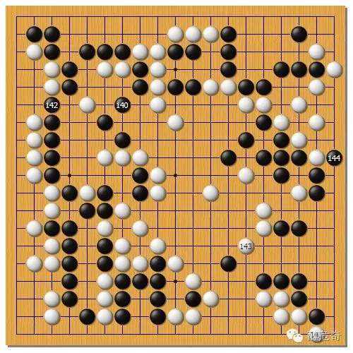 09谱140手有所收获。141扳的时候遭到黑脱先黑棋142想先手把中间三颗残子吃净,白棋143脱先加强中间,黑144也脱先于一路打吃。这里的官子计算,的确判断不清楚大小。