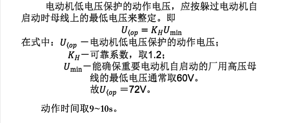 电动机起动时间按实测的最长起动时间的1.2倍整定起动时间,以判断电动机起动是否结束。当没有实测数据时,循环水泵、电动给水泵、送风机、吸风机、磨煤机取20s,排粉机取15s,其他一些起动较快的电动机取10s。