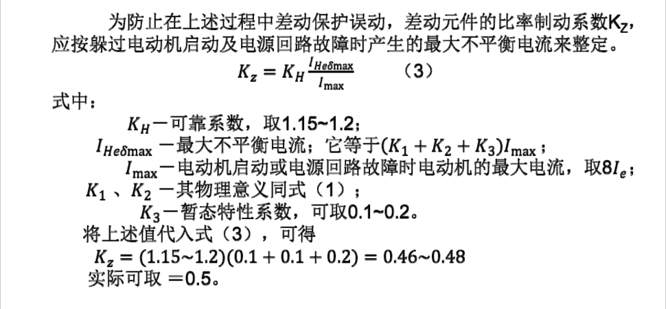 为防止在上述过程中差动保护误动,差动元件的比率制动系数Kz,应按躲过电动机启动及电源回路故障时产生的最大不平衡电流来整定。