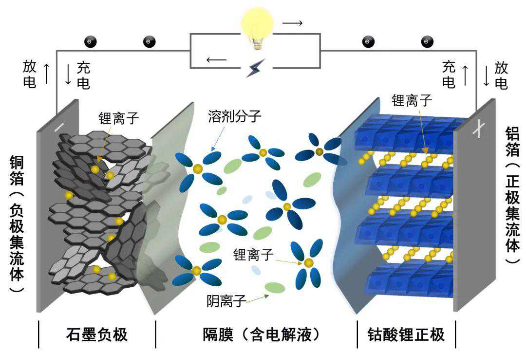 锂离子电池正负极中间被含电解液的隔膜隔开。亏电状态下,Li存在于阳极,即上图右侧的电极,充电时,Li从电池内部通过含电解液的隔膜,从正极移动到负极,电子则由集流体通过外部导线,从正极移动至负极。放电过程相反,储存在负极中的Li通过隔膜回到正极,电子通过外部电路从负极移动至正极