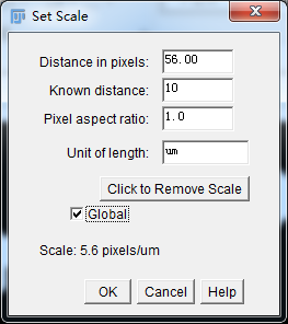 Analyze-SetScale,在已知距离中填入10μm,选择Global则校正标尺对本次打开所有图片均有效。