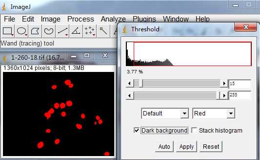 Image-Adjust-Threshold调节阈值,选择所有阳性信号(红色代表选中,背景为黑色勾选Darkbackground):