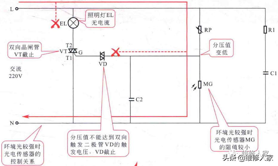 当环境光较强时,光电传感器MG的阻值较小,使电位器RP与光电传感器MG处的分压值变低,不能达到双向触发二极管VD的触发电压值。双向触发二极管VD截止,不能触发双向晶闸管,VT处于截止状态,照明灯EL不亮;
