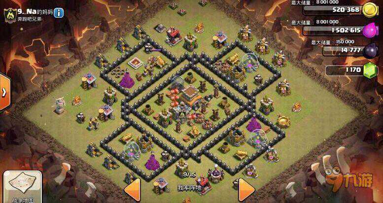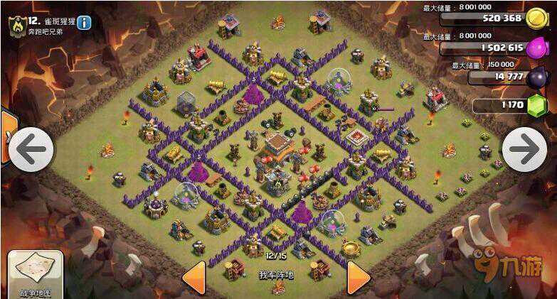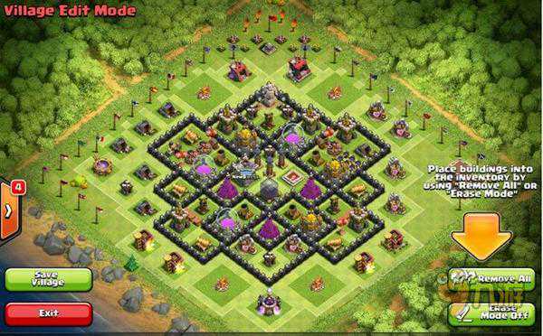 3、防空打造铁三角。红气球和黑气球堆叠在防空前方,可以有效杀掉前来对抗防空的气球和龙。7个仓库点的分布正好挡住了重要的防御建筑,起到了中层城墙的作用。