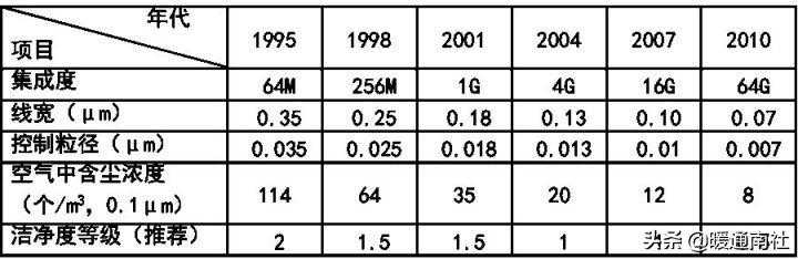 工业洁净室的主要控制对象是灰尘粒子。它广泛应用于电子工业、光电子工业、机械化工工业、光学工业、航天事业等。在电子工业中微电子(集成电路)工业对洁净室的洁净度级别要求最高。而且,随着微电子技术的不断发展,集成度的不断提高,光刻线宽的不断变小对洁净室洁净度等级的要求也越来越高。根据国际半导体工业协会(SIA)对未来集成电路发展趋势,以及对洁净生产环境中尘粒控制的趋势预测可以看到微电子工业对洁净室洁净度的要求。