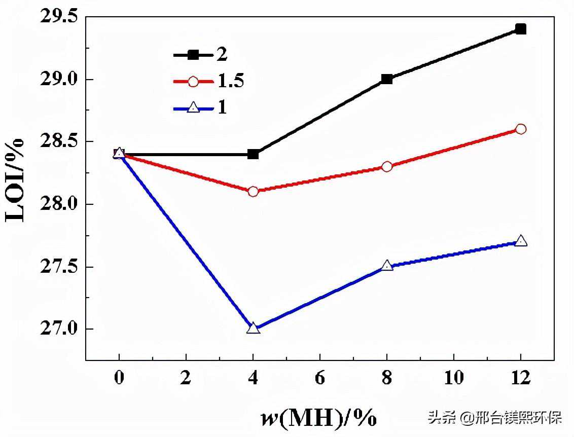 图1是MH对PVC压延膜的阻燃性能的影响。从图1可以看出,当Sb2O3用量为2份时,随着MH的添加量的增大,复合材料的LOI值逐步增大,其中MH添加量为12份时,LOI值最高;当MH的添加量为4份时,复合材料的LOI值与未替代前的复合材料LOI值一致。当Sb2O3用量为1.5份和1份时,复合材料的LOI值先下降后升高。当Sb2O3用量为1.5份时,MH的添加量达到8份时,复合材料的LOI值与未替代的复合材料基本相当。当Sb2O3用量为1份时,复合材料的LOI值下降较为明显,仅在MH添加量为12份时,复合材料的LOI值仍然低于未替代的复合材料。由此可见,采用MH部分替代三氧化二锑时,最佳配方体系为Sb2O3用量为2份、MH用量为4份,三氧化二锑的使用量要保持在1.5份以上。