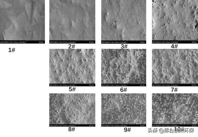图4是不同MH含量的PVC压延膜残炭的SEM照片。从照片中可看出,只添加Sb2O3作为协效剂,残炭表面平整,没有明显的裂纹;当Sb2O3的添加量下降,相同MH添加量的情况下,残炭表面形成了更多的微球,并逐步形成更多的裂缝;同时,当Sb2O3的添加量相同的情况下,随着MH的增加,残炭表面逐渐出现裂纹,当添加量为12份时,裂纹最为明显。由此可见,MH替代部分Sb2O3后,在残炭表面形成了耐火的MgO微球,这些微球能在一定程度上提供覆盖功能,提高阻燃性能;同时,MH在燃烧过程中释放出来的水气能稀释可燃性气体和空气,并且,释放的水气过多时也会在一定程度上破坏炭层的致密性,从而降低阻燃性能。因此,从SEM照片看,Sb2O3的添加量为2份,MH添加量为4份时,残炭的致密性最佳。